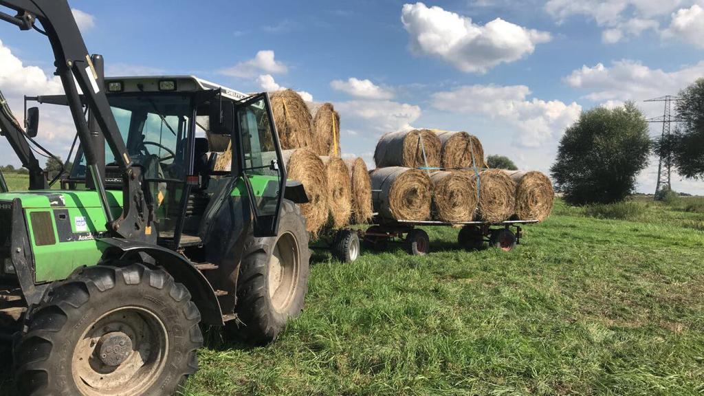 Diesen Anhänger nutzen wir noch zum Ballentransport. Normal nehmen wir zwei umgebaute 8,5t Hänger, aber mit denen ist es bei unseren schmalen und kleinen Auffahrten auf die Flächen leider sehr schwer. Der letzte Anhänger kommt meistens ins den Graben, und bevor da was umkippt nutzen wir diesen Hänger, um die Ballen von den Flächen zusammen zu fahren und dann auf die anderen zu verladen.